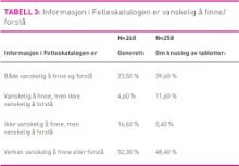 Behov for mer kunnskap om bruk av Felleskatalogen hadde laveste skår (tabell 2). I underkant av 30 prosent oppga stort behov, mens 22,4 prosent ikke hadde behov for mer kunnskap. Nærmere halvparten syntes imidlertid at informasjon i Felleskatalogen er vanskelig å finne og/eller vanskelig å forstå (tabell 3). Når spørsmålet ble presisert til knusing og deling av tabletter, var over halvparten enig i at informasjon i Felleskatalogen er vanskelig å finne og/eller vanskelig å forstå. Opplevelse av at informasjon i Felleskatalogen er vanskelig å finne og vanskelig å forstå hadde en signifikant sammenheng med behovet for mer kunnskap om bruk av Felleskatalogen. Regresjon viste at flere av dem som synes det er vanskelig å finne og forstå informasjon i Felleskatalogen, oppga stort behov for mer kunnskap om Felleskatalogen enn dem som ikke har vansker med å finne og forstå informasjon (B=0,44, SE=0,11, β=0,31, p