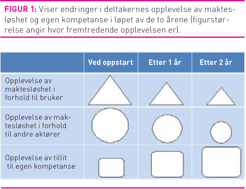 Ved prosjektets oppstart meddelte en av deltakerne seg slik: «Jeg er nesten alltid usikker på om det jeg har gjort er bra og riktig. Jeg føler meg usikker på min egen kompetanse … Vet ikke om mine vurderinger er riktige». Etter to år beskrev hver av deltakerne en personlig utvikling, fra faglig usikkerhet og liten tillit til egne vurderinger mot større trygghet og tillit til egen kompetanse. Dette ble illustrert gjennom en fortelling der en deltaker hadde fått vite at en bruker hadde det vanskelig. Hun visste at hun skulle inn i leiligheten og snakke med vedkommende. Hun sa: «Før var jeg alltid usikker på hva jeg skulle si. Nå går jeg inn og har mer tillit til meg selv, og da går samtalen mye lettere. Jeg kan faktisk gå ut etterpå og tenke at dette gikk veldig bra. Og sånn hadde jeg det i alle fall ikke for to år siden. Så jeg har utviklet meg. Jeg føler meg mye tryggere».