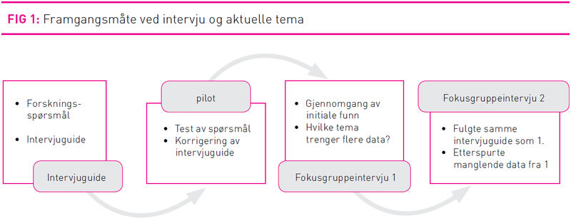 Det ble utført to fokusgruppeintervju med intervjuguide, ett i juni 2010 og ett i september 2010. Intervjuguiden ble gitt et semistrukturert design basert på Casey og Kruegers metode (13). Intervjuguiden ble testet ut og justert etter en pilotundersøkelse der det deltok to sykepleiere med erfaring fra området som hadde sagt seg villige til å være med på en test av spørsmålene.