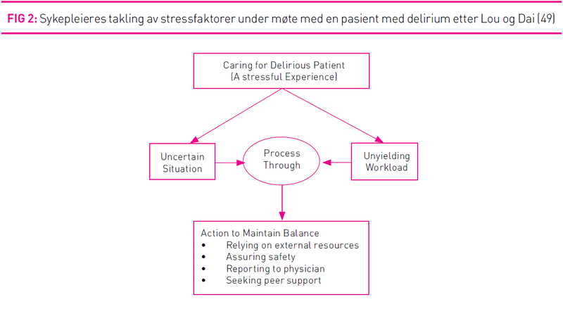 God skjerming, ernæring, omsorg, kommunikasjon og informasjon er sentralt for å forebygge delirium (22,44,47). I engelsk språkdrakt finnes det over 50 synonyme begrep som beskriver delirium eller akutt forvirring (21). Dette kan gjøre det vanskelig å få oversikt over forsk-ningslitteratur om teamet. Flere studier framhever multikomponentintervensjoner med flere yrkesgrupper som metode for å forebygge delirium (15,36,19). Volmer et al. (23) og Robinson et al. (28) beskriver også sykepleieintervensjoner som sentrale i forebygging av delirium. Anderson (56) peker på at mange av intervensjonsstudiene konkluderer med at omsorg og pleie av høy kvalitet er det som er positivt utslagsgivende.
