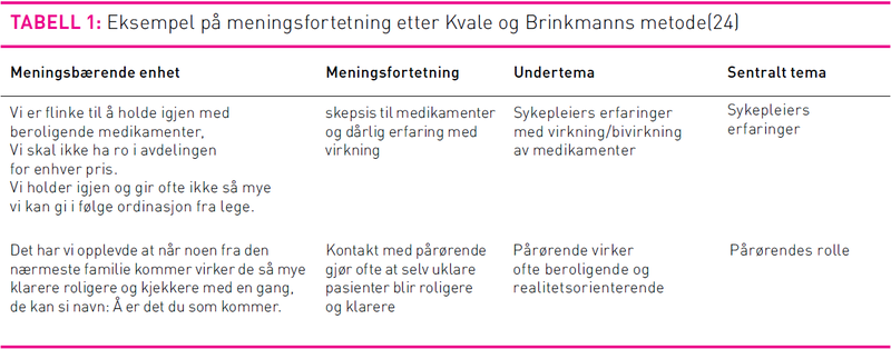 Metode: Studien er av beskrivende karakter og med bruk av kvalitativ metode. Det ble utført to fokusgrupppeintervju med til sammen 11 deltakere, ni sykepleiere og to hjelpepleiere. Intervjuanalysen ble utført etter en metode utarbeidet av Kvale og Brinkmann.