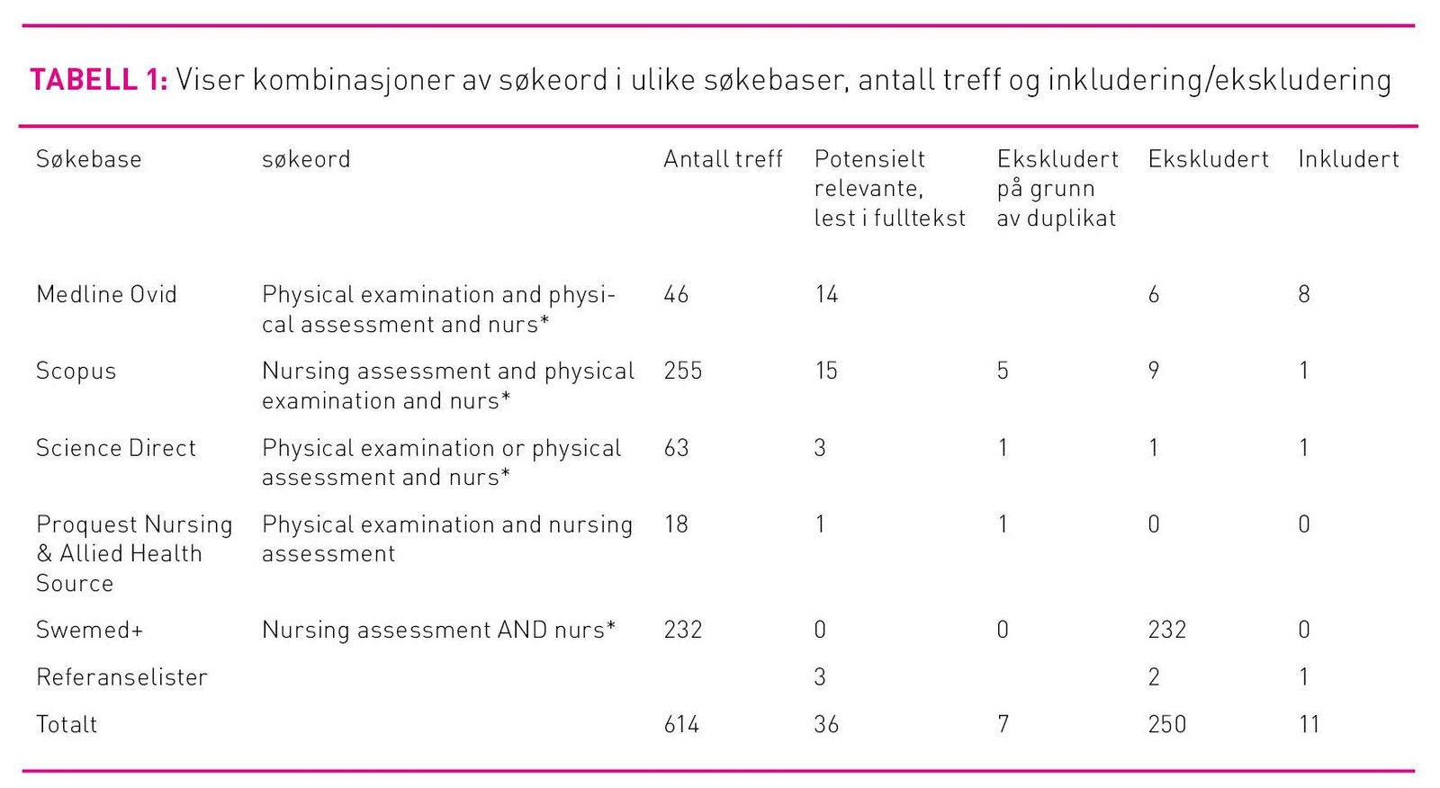 Et systematisk litteratursøk ble gjennomført i databasene Swemed+, Medline, Scopus, Science Direct og Proquest Nursing & Allied Health Source i august 2012. Søkeordene var physical assessment, nursing assessment og physical examination kombinert med nurs*. Vi kombinerte søkeordene med and/or i de ulike databasene (se tabell 1). Referanselistene i inkluderte studier ble gjennomgått for å se etter relevante studier.
