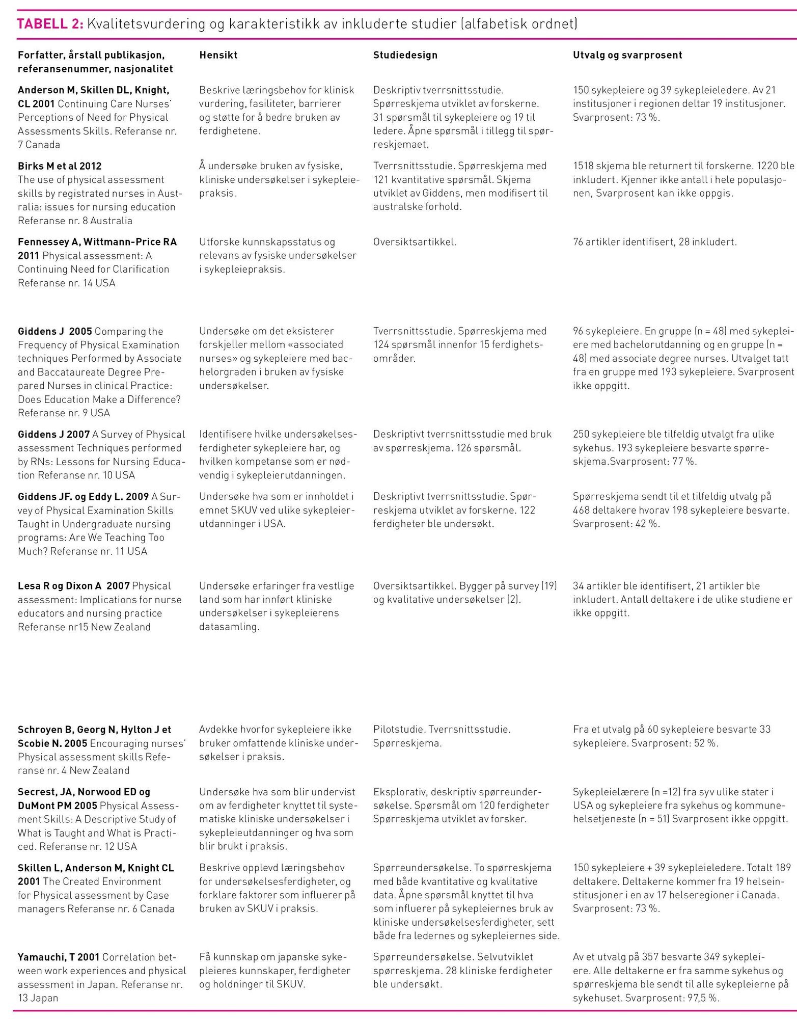 Ni av studiene (4,6,7–13) er spørreundersøkelser. Dette er en tilfredsstillende måte å kartlegge hvilke undersøkelsesferdigheter som benyttes i praksis og hvilke det undervises i. Svarprosenten varierte fra 42 prosent til 98 prosent. Utvalgsstørrelsen varierte fra 33 til 1220 personer. Små studier gjør generalisering vanskelig. Når vi tar de med, skyldes det at funnene bekreftes i større studier. To av artiklene er oversiktsartikler (14,15). I Lesa og Dixons oversiktsartikkel er tre av primærstudiene inkludert (6,7,12). Fennessey og Wittmann-Prices artikkel inkluderer fire av primærstudiene (10–13).