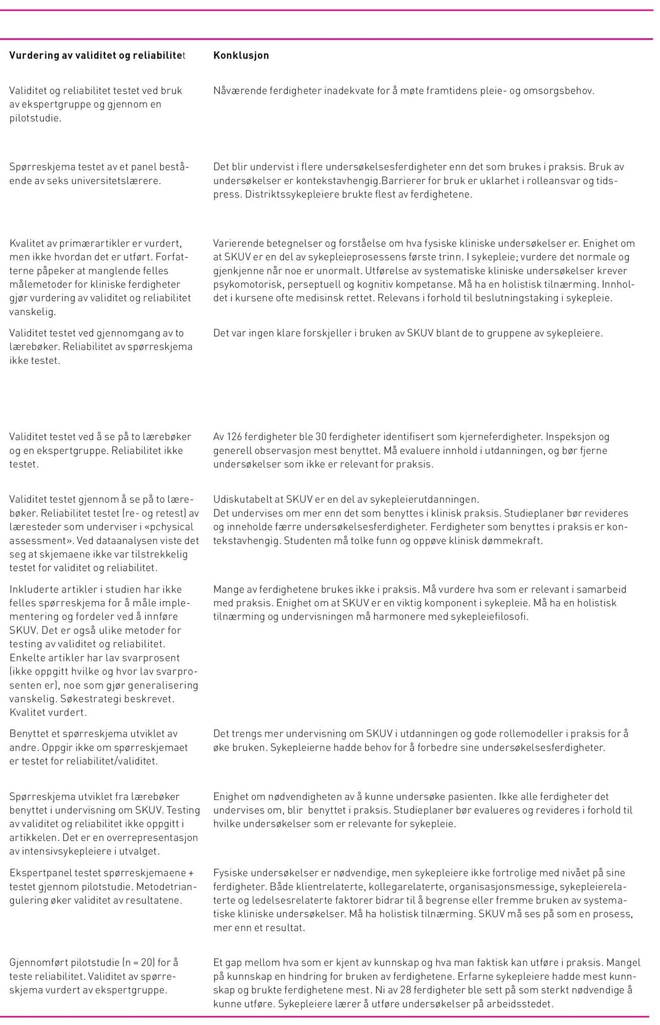 Forfatterne har i hovedsak brukt egenkomponerte spørreskjemaer, noe som gjør sammenlikning av resultater vanskelig. Lesa og Dixon og Fennessey og Wittmann-Price (15,14) skriver at det ikke er utviklet en enhetlig metode for vurdering av spørreskjemaene og heller ikke for hvordan validitet og reliabilitet skal vurderes. Dette er en svakhet i forskningsdokumentasjonen vi har funnet om SKUV. Lesa og Dixons oversiktsartikkel (15) bygger på 19 surveystudier og to kvalitative studier. Søkestrategien beskrives, men har kun med inkluderingskriterier som går på engelsk språk og at det ikke er tidsbegrensning på publisering. De beskriver ikke ekskluderingskriterier, og slikt sett følger de ikke standard for systematisk review. Artikkelen har ingen tabeller over karakteristika av inkluderte studier, men i resultatdelen er studiene godt beskrevet. Metodisk kvalitet vurderes som moderat. Fennessey & Wittmann-Price’s oversiktsartikkel (14) har en mangelfullt beskrevet søkestrategi. Det oppgis ikke antall treff på søkene, men av 76 potensielt relevante artikler ble 28 inkludert. Artikkelen gir nyttig informasjon, men søkestrategi og utvelgelse kunne vært bedre beskrevet. Metodisk kvalitet kan betegnes som moderat til mangelfull. Begge oversiktsartiklene har benyttet relevante databaser og søkeord. Artikkelen til Birk et al. (8) benyttet samme spørreskjema som Giddens (10), men modifisert til australske forhold. De fleste oppgir testing av spørreskjema for validitet/reliabilitet (tabell 2).