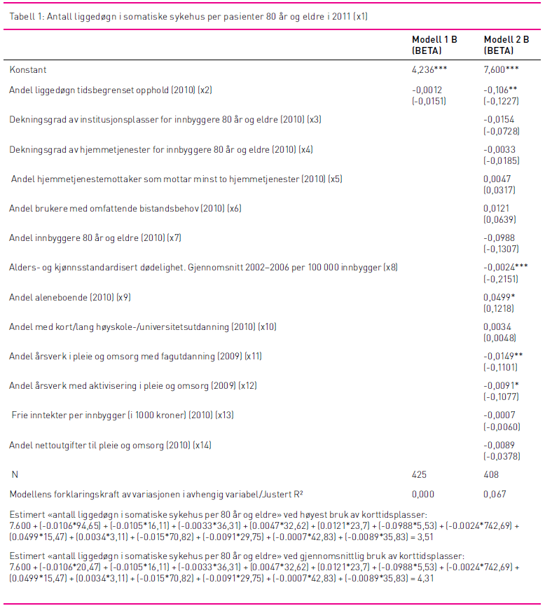 Resultater: Analysen viser at somatiske pasienter på 80 år og eldre har lavere liggetid i sykehus i kommuner med utstrakt bruk av korttidsplasser. Artikkelens hypotese får dermed støtte. Selv om korttidsplassene forklarer relativt lite av variasjonen i antall liggedøgn, har andelen korttidsplasser en betydning for liggetiden på somatiske sykehus for de eldste som er statistisk signifikant, også når vi kontrollerer for en rekke andre relevante variabler.
