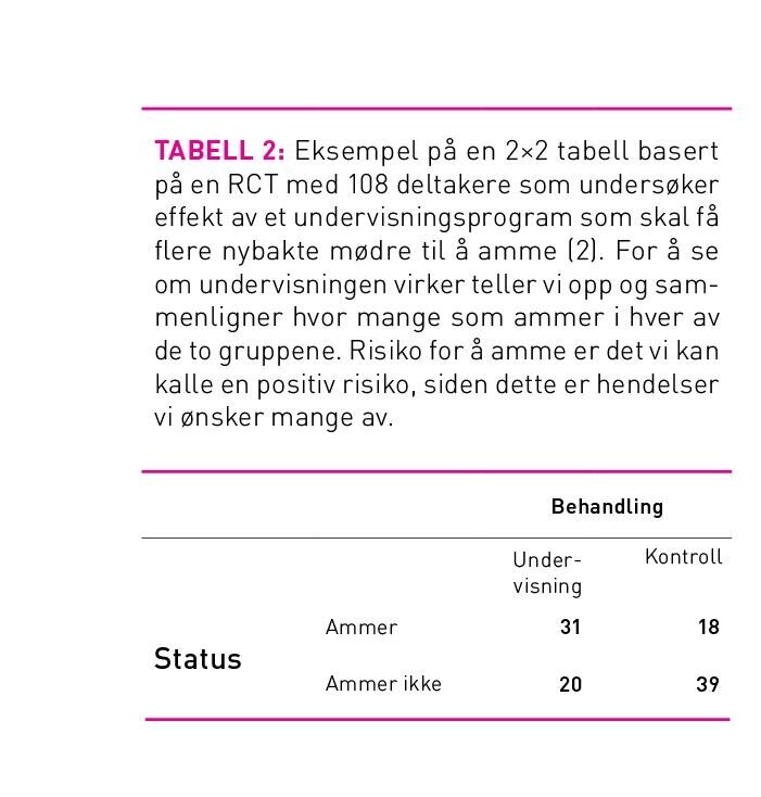Generelt kan vi si at forskjellen mellom to grupper er liten så lenge risiko ratio (RR) er nær én. Hvordan du skal fortolke risiko ratioer vil imidlertid variere. Så lenge vi snakker om en negativ risiko (for eksempel risiko for død) vil små RR (mindre enn én) vise fordel i favør av intervensjonsgruppen. I statistikken snakker vi imidlertid også om positiv risiko som vi ser eksempel på i tabell 2. Tabell 2 tar utgangspunkt i en studie som undersøkte om et undervisningsprogram fikk flere nybakte mødre til å amme (2). Her ser man altså på risiko for at mødre velger å amme. Siden amming er en ønsket hendelse vil store RR (større enn én) gå i favør av intervensjonsgruppen.