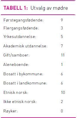For å belyse problemstillingen valgte vi et strategisk utvalg (32) der mødre ble rekruttert av helsesøstre på seks helsestasjoner fra by og landdistrikt (se tabell 1). Inklusjonskriteriene var mødre som hadde opplevd stressfylt amming, avsluttet amming før seks måneder, hadde god erindring av situasjonen, tilfredsstillende norskkunnskaper og var psykisk friske. Barna til mødrene i utvalget var single og friske. Et barn var født fire uker før termin, mens øvrige barn var født til termin. En mor avsluttet amming etter to uker, mens de øvrige 11 mødrene ammet fra to til seks måneder. Morsmelkerstatning ble gradvis introdusert i denne perioden. Størrelsen på utvalget ble vurdert i forhold til et metningspunkt som kan oppnås når det ikke synes å komme ny informasjon (32). I denne studien ble 12 kvinner intervjuet.