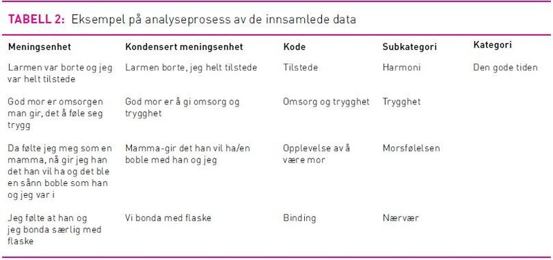 Dataanalysen er inspirert av Graneheim og Lundman (34) sin framgangsmåte innen kvalitativ innholdsanalyse som anvendes for å identifisere likheter og forskjeller i tekstmaterialet. Fordi formålet i denne studien var å forstå og beskrive informantenes ulike perspektiver synes den hensiktsmessig. Den transkriberte teksten ble først lest flere ganger for å få en opplevelse av helheten. Meningsbærende enheter ble identifisert i tekstmaterialet, kondensert og kodet. Koder med tilsvarende innhold ble satt sammen til subkategorier og kategorier (se tabell 2). Transkripsjonen ble deretter gjennomlest for å kontrollere at ingen koder var utelatt (33).