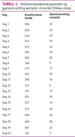 Utforskning av sammenhenger står svært sentralt i statistikken, og vi har tidligere sett på sammenhengen mellom statiner og kolesterolreduksjon (1). Tabell 1 viser antall besøkende på et akuttmottak sammen med gjennomsnittlig ventetid per pasient (fiktive data). Av tabellen ser vi sterke indikasjoner på en sammenheng mellom antall besøkende og ventetid. For dagene 10, 17 og 18 er det over 400 besøkende, og gjennomsnittlig ventetid er nærmere tre kvarter. På dag 8, 12 og 20 er det få besøk, og ventetiden er under ti minutter. Sammenhengen blir enda lettere å se når vi plotter data som vist i figur 1.