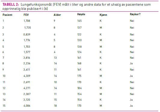 Tabell 2 viser et utvalg av data som opprinnelig ble analysert i (5). FEV er et lungefunksjonsmål som viser hvor mye luft en pasient evner å puste ut i løpet av et sekund. I tillegg til FEV har vi for hvert barn/ungdom informasjon om alder, høyde, kjønn og røykestatus. Totalt ble det gjennomført målinger for 654 barn og unge mellom 3 og 19 år. Hvis vi beregner korrelasjonen mellom FEV og røykestatus får vi 0,25 med 95 prosent konfidensintervall fra 0,17 til 0,32. Ifølge disse resultatene har barn/unge som røyker bedre lungefunksjon enn de som ikke røyker. Et slikt resultat er overraskende og skyldes at andre faktorer lurer i kulissene. Videre analyser viser nemlig at det er en korrelasjon både mellom alder og FEV og mellom alder og røyking. Det betyr – ikke overraskende – at lungefunksjonen bedres etter hvert som barna vokser, og at det i all hovedsak er de eldste i datasettet som røyker. Den egentlige (og negative) sammenhengen mellom røyking og lungefunksjon er totalt overskygget av den sterke positive sammenhengen mellom alder og FEV. Vi sier at alder er en konfunderende (confounding) variabel for sammenhengen mellom FEV og røyking.
