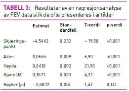 Ved bruk av lineær regresjon kan man i større grad isolere effekten av en og en faktor. Vi ønsker nå å bruke lineær regresjon til å undersøke hvilke faktorer som kan forutse (predikere) lungefunksjon (FEV). Vi sier at FEV er den avhengige variabelen i analysen. Faktorene vi bruker til å predikere FEV, her vil det si alder, høyde, kjønn og røykevaner, kalles uavhengige variabler. Tabell 3 viser resultatet av en regresjonsanalyse slik de gjerne presenteres i forskningsartikler. Lengst til høyre i tabellen ser vi en kolonne med p-verdier, og vi ser at alder, høyde og kjønn har svært små p-verdier. Det betyr at vi har en sterk sammenheng mellom FEV og disse faktorene. I kolonnen «Estimat» ser vi at verdiene er positive for alle tre variablene, som betyr at vi har en positiv sammenheng mellom FEV og disse variablene, for eksempel at FEV blir høyere med alder. Verdien 0,0655 sier oss at hvis vi sammenlikner to barn/unge med ett års aldersforskjell, men som har samme høyde, kjønn og røykevaner, vil FEV i gjennomsnitt være 0,0655 liter høyere hos den eldste. Vi har altså isolert effekten av alder. Tilsvarende ser vi at en gutt vil ha en FEV som i gjennomsnitt er 0,157 liter høyere enn ei jente så lenge de to har samme alder, høyde og røykevaner. En person som røyker vil derimot ha en FEV som i gjennomsnitt er 0,0872 liter lavere enn eller lik en ikke-røyker. Rett nok er ikke denne sammenhengen statistisk signifikant (p-verdi 0,141), men dette resultatet er mer i tråd med det vi vet om røykingens negative effekter enn da vi kun så på korrelasjonen mellom røyking og FEV. Vi kan si at regresjonsanalysen har hjulpet oss med å kontrollere for alder, høyde og kjønn.