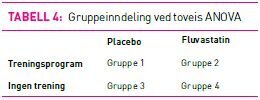 Ved bruk av ANOVA kan vi altså studere effekten av flere faktorer samtidig. Tenk at vi ønsker å studere den kombinerte effekten av statiner og trening på reduksjon av kolesterol. For å undersøke dette kan vi lage oss et oppsett der forsøkspersonene plasseres tilfeldig i fire grupper (tabell 4). Vi ser at pasientene i gruppe 2 får statiner i tillegg til et spesifikt treningsprogram. Personene i gruppe 3 får placebomedisin og ikke noe treningsprogram. Ved bruk av ANOVA kan vi nå undersøke effekten av statiner og trening, og samtidig kan vi finne ut om kombinasjonen av statiner og trening har ytterligere effekt enn statiner eller trening alene. På tilsvarende måte som når vi sammenlikner to grupper (2), er signifikans, p-verdi og konfidensintervall viktige tall å se etter i artikler hvor ANOVA benyttes.