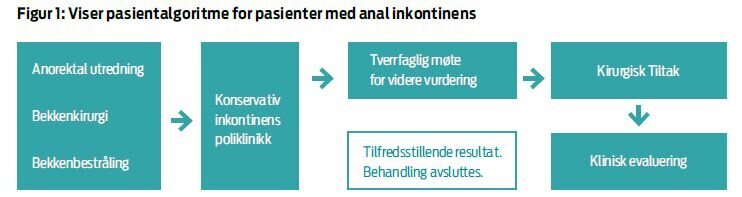 I 2009 ble Konservativ inkontinens-poliklinikk (KIP) startet for å bedre behandlingstilbudet til den gruppen pasienter med avføringsproblemer ved Universitetssykehuset Nord-Norge. Poliklinikken ble opprettet som et ledd mellom utredning/identifisering av symptomer og kirurgi (figur 1). Konservativ behandling før kirurgi er viktig og verdifullt både for pasienter og helsetjenesten.