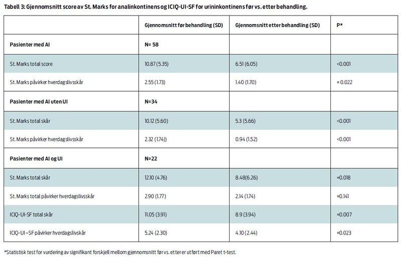 Resultatene viser en bedring på 50 prosent ved konservativ behandling av anal inkontinens (tabell 3). I tilfeller hvor pasienten også har urininkontinens er bedringsprosenten ikke like høy for urininkontinens (tabell 3 og figur 2). Av 58 pasienter blir 32 (55 prosent) så bra at behandlingen kan avsluttes (tabell 2).
