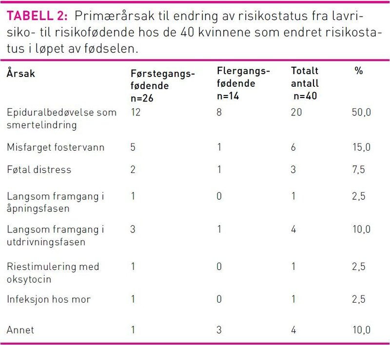 Nær dobbelt så mange førstegangsfødende (n=26) som flergangsfødende (n=14) i lavrisikogruppen endret status i fødselsforløpet (figur 1). Det vil si at 38,1 prosent totalt endret status. Endringen skjedde ved  gjennomsnittelig 6,5 cm åpen mormunn (SD 2,33). Den vanligste årsaken var behov for epiduralbedøvelse, andre årsaker var føtalt distress, misfarget fostervann og langsom framgang i fødselen (tabell 2). Av de 40 kvinnene som av ulike årsaker gikk over til å være risikofødende under fødselen, fikk 13 førstegangsfødende og ni flergangsfødende epiduralbedøvelse. Atten av disse ble i tillegg riestimulert med oksytocin, det vil si at 81,8 prosent av friske kvinner som startet som lavrisikofødende og som mottok epiduralbedøvelse også ble oksytocinstimulert. Totalt 26 kvinner (24,8 prosent) som startet som lavrisikofødende ble stimulert med oksytocin. Førstegangsfødende sto for størsteparten av dette (18 kvinner/69,2 prosent). Åpningstiden for førstegangsfødende var i gjennomsnitt 8,0 timer (SD 4,5), og utdrivningstid var 41,6 min (SD 23,6), for flergangsfødende 3,8 timer (SD 2,6), og utdrivningstid var 20 min (SD 21,9). Det var ingen signifikant forskjell i antall timer i aktiv fødsel (p=0,296 to-utvalgs t-test), heller ikke i aktiv utdrivningstid (p=0,468 to-utvalgs t-test) mellom lavrisikofødende og risikofødende.