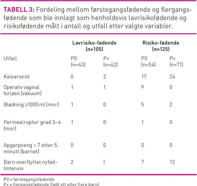 Resultater: Det var 97 førstegangsfødende (42,2 %) og 133 flergangsfødende (57,8 %). Av disse var 105 lavrisikofødende (45,7 %) og 125 risikofødende (54,3 %). Andelen lavrisikofødende som fødte uten intervensjon og forble i lavrisikogruppen var 61,9 %. Andelen som endret risikostatus under fødselen var 38,1 %, halvparten på grunn av epiduralbedøvelse som smertelindring. I lavrisikogruppen ble 1,9 % forløst ved hjelp av vakuum og 1,9 % med keisersnitt, 96,2 % av kvinnene fødte spontant. I risikogruppen ble 7,2 % forløst ved hjelp av vakuum og 32,8 % med keisersnitt. Andelen kvinner som fikk sfinkterruptur var 0,9 % i begge gruppene. Ingen barn fikk apgarpoeng < 7 etter 5 minutter. Overflytning til nyfødtintensiv var 2,9 % i lavrisikogruppen, 15,2 % i risikogruppen.