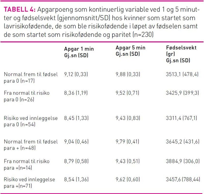 Deskriptive data for utkomme hos lavrisikofødende og risikofødende fordelt på paritet, samt neonatale fødselsutfall, er vist i tabell 3. I lavrisikogruppen (n=105) fødte 101 kvinner (96,2 prosent) spontant vaginalt. To (1,9 prosent) ble operativt vaginalt forløst (vakuum), begge hadde fått epiduralbedøvelse og oksytocinstimulering. To flergangsfødende (1,9 prosent) ble akutt forløst med keisersnitt, de hadde verken fått epiduralbedøvelse og/eller oksytocinstimulering. En førstegangsfødende hadde etterbyrdsblødning >1000 ml. En førstegangsfødende fikk perinealruptur grad 3–4 (0,9 prosent).