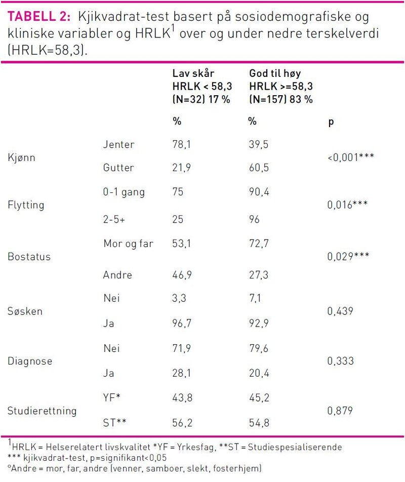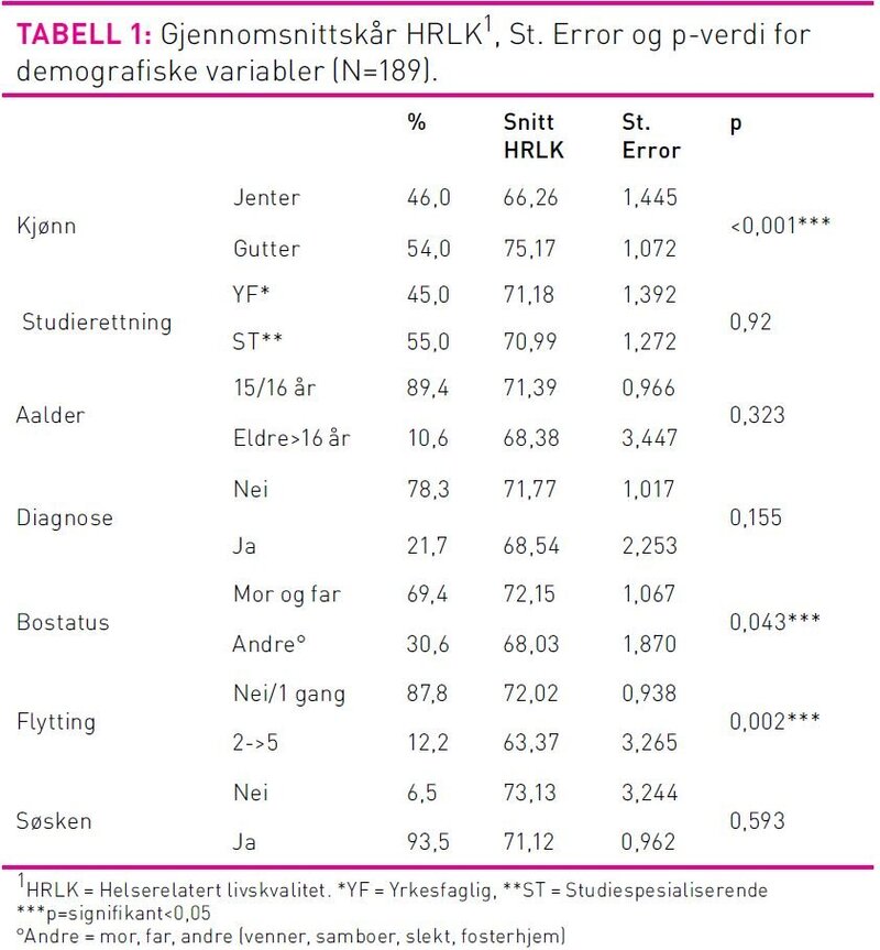 De sosiodemografiske variabler ble gjort dikotome: alder (15/16 år eller >16 år), bostatus (mor og far, eller andre som bare mor eller far, venner, annen slekt, fosterhjem), flytting (nei/en gang eller to/flere ganger) og søsken (nei eller ja). Beskrivende statistikk ble brukt for å gi en oversikt over sosiodemografiske variabler og for å beskrive utvalgets HRLK og egenvurdert helse. Uavhengig T-test ble brukt for å sammenlikne gjennomsnittlig HRLK mellom to uavhengige grupper basert på de dikotome sosiodemografiske variablene. Kjikvadrat-test ble brukt for å undersøke forskjellen mellom alle de dikotome bakgrunnsvariablene og gruppene som skåret henholdsvis under og over nedre terskelverdi. Pearson r ble brukt for å se på sammenhengen mellom HRLK og egenvurdert helse. Multippel regresjonsanalyse ble anvendt for å undersøke sammenhenger mellom HRLK og sosiodemografiske variabler. HRLK ble definert som avhengig variabel og demografiske variabler som uavhengige. En p-verdi