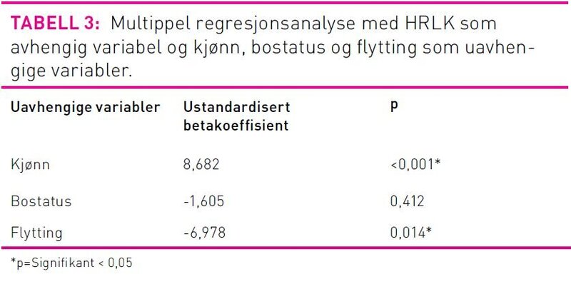 Den multiple regresjonsanalysen viste at kjønn og hyppig flytting var signifikant assosiert med HRLK med ustandardisert beta og p-verdi på henholdsvis 8,682, p=< 0,001 og -6,978 og p=0,014.