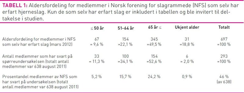 Tabell 1 gir et bilde av representativiteten av innsamlet data. Antall hjerneslagrammete registrert i foreningen i mars 2012 var 697 personer. Ved utsending av spørreundersøkelsen var antall medlemmer som selv har erfart hjerneslag 638. Tabellen viser at 49,5 prosent av alle medlemmene som selv har opplevd et hjerneslag er over 65 år. 154 informanter (52,6 prosent) av deltakerne i vår undersøkelse var over 65 år ved innsending av spørre-skjemaet.