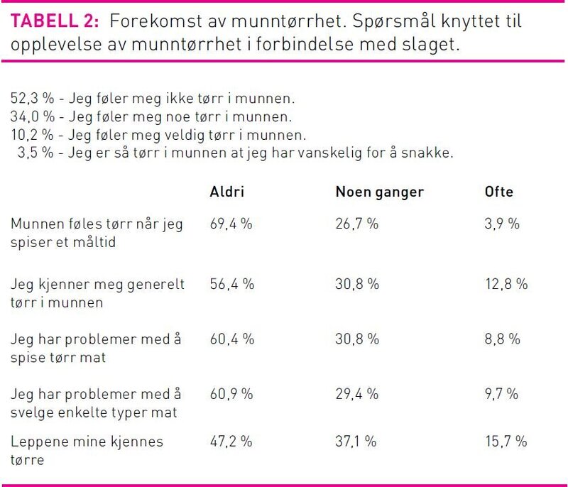 Tabell 2 viser en oppsummering av resultatene for munntørrhet vist i prosent av N=293. Tabellen viser at 47,7 prosent av alle slagrammete i denne studien opplever middels til sterk grad av munntørrhet etter slaget.