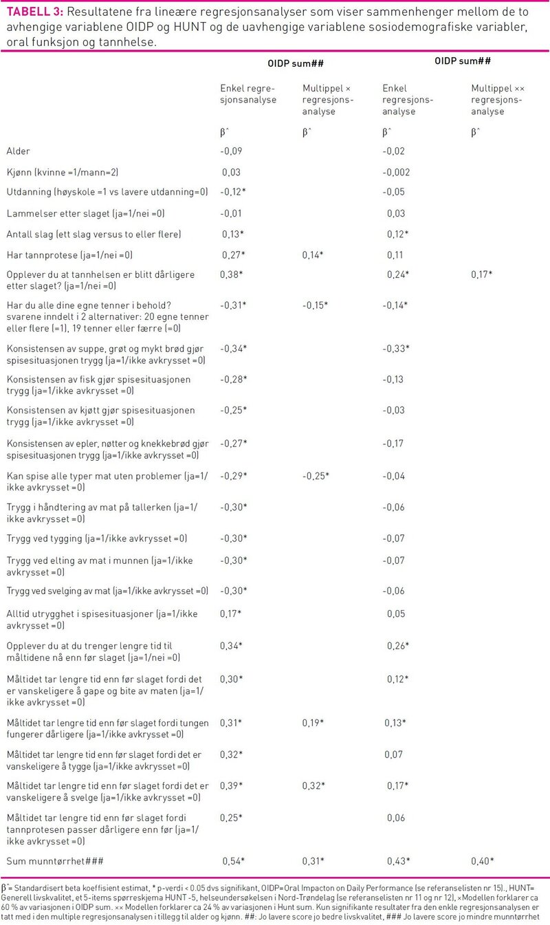 Tabell 3 viser resultatene fra de enkle og multiple lineære regresjonsanalysene. Resultatene fra de enkle regresjonsanalysene viser at de som kun hadde erfart et slag, eller ikke hadde tannprotese, eller ikke opplevde at tannhelsen var blir dårligere, og hadde 20 eller flere egne tenner i behold hadde bedre score i OIDP sum og Hunt sum enn de som hadde mindre gunstige skår på de nevnte variablene. I tillegg scoret de med høyskole/universitetsutdanning bedre på OIDP enn de med lavere utdanning. Den univariate analysen viste at det var bedre generell og oral helserelatert livskvalitet blant dem som svarte ja på spørsmål om hvorvidt konsistensen av suppe, grøt og mykt brød gjør spisesituasjonen trygg i forhold til de som ikke valgte dette alternativet. Det var en signifikant sammenheng mellom det å trenge lengre tid til måltidene etter slaget og dårlig livskvalitet. Tabell 3 viser at de som var trygge ved elting av mat i munnen, ved svelging av mat eller alltid trygge i spisesituasjoner scoret bedre på OIDP enn de som ikke hadde krysset av for disse alternativene.