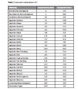 Til tross for manglende nasjonal oversikt, førte disse funnene til at jeg ble interessert i å se hvordan strykprosenten i praksis ved landets utdanninger ser ut. For å få et bilde av situasjonen ba jeg Norsk samfunnsvitenskapelige datatjeneste (NSD) om å få en utskrift over resultatet for alle eksamenene ved alle landets sykepleieutdanninger. På bakgrunn av denne informasjonen fikk jeg regnet ut hvor mange som strøk i teori og praksis i 2011. Det viste seg at utdanningene bruker ulike emnekoder og emnenavn på sine praksisperioder. Strykprosentene er derfor ikke 100 prosent korrekt, da tallene bygger på det jeg har klart å tyde som praksis ut ifra utskriften. Avvik fra den totale strykprosenten ved hver enkelt institusjon forekommer, men alt i alt gir oversikten et godt bilde av strykprosenten i praksis i 2011. (Se tabell 1 på neste side.)