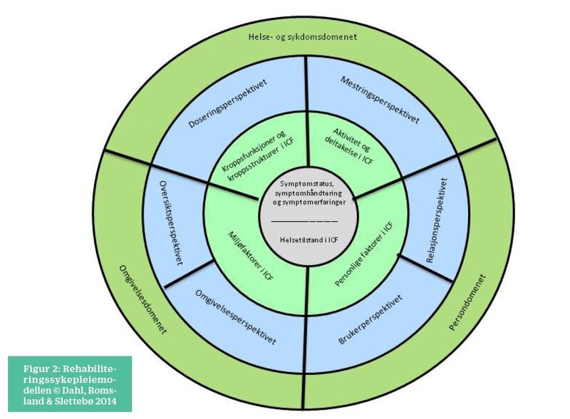 Sykepleiernes beskrivelser kunne samles i seks teoretiske perspektiver: et relasjonsperspektiv, et brukerperspektiv, et doseringsperspektiv, et mestringsperspektiv, et omgivelsesperspektiv og et oversiktsperspektiv. Perspektivene ble forankret i persondomenet, helse- og sykdomsdomenet og omgivelsesdomenet i sykepleiens symptomhåndteringsmodell (SMM) (13). Denne modellen ble valgt fordi SMM’s tre domener tilsvarer områder som utgjør grunnlaget for begrepet helhetlig rehabilitering (14). Tilsvarende områder ligger til grunn for ICF-modellen (7).