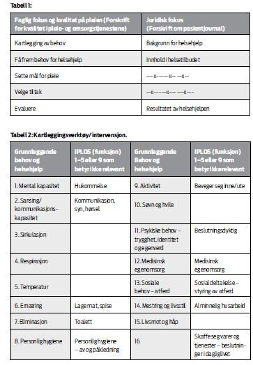Innholdet i EPJ-systemets rapportenhet ble også studert i prosjektet. Vi fant at systemet har mangler når det gjaldt systematisk lagring av informasjon om helsehjelp. I noen kommuner var det funksjonsområdene i IPLOS (8) som strukturerte innholdet i kartleggingen. Andre kommuner hadde rutiner for hvilke funksjonsområder som skulle kartlegges og registreres i journalen ved innkomst. De ansatte opplevde det som utfordrende å holde behandlingsplanene oppdatert. I tillegg er kartleggingen IPLOS-registreringen gir mangelfull, da behov som psykiske behov, åndelige behov, søvn, sirkulasjon og respirasjon for å nevne noen, ikke blir registrert i IPLOS.