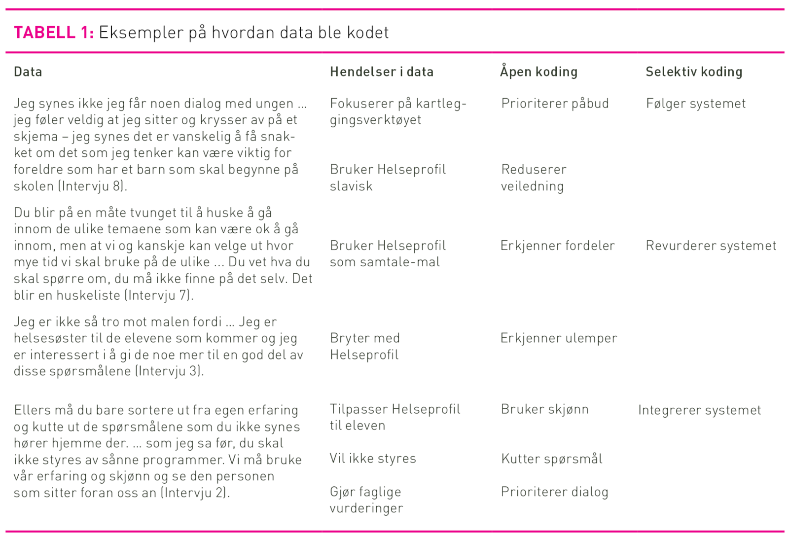 Analysen består av åpen, selektiv og teoretisk koding (29–31). Ved åpen koding (tabell 1) gjennomgikk vi teksten og satte navn på hendelser. En begrepsindikatormodell, hvor hendelser ble gruppert i et overgripende begrep der ord eller fraser i teksten virket som indikatorer, var til hjelp (figur 1) (30). På denne måten kontrollerte vi at begrep som framkom fra data, hadde sitt grunnlag i empirien (36). Førsteforfatter skrev fortløpende notater om data og etter hvert om mulige sammenhenger i datamaterialet. Dette var en viktig del av analysearbeidet. Etter fire individuelle intervjuer og et fokusgruppeintervju, hadde vi grunnlag for å utvikle hypoteser om hva som foregikk innen det studerte området, det vil si at vi identifiserte hovedutfordringen til deltakerne og ante kjernekategorien som fanget opp hvordan de håndterte utfordringen. Kodingen fortsatte selektivt med vektlegging av kategorier som relaterte til kjernekategorien. Med en deduktiv tilnærming utvidet og bekreftet de neste intervjuene våre hypoteser og la grunnlag for teoridannelsen. Hele analyseprosessen var preget av konstante sammenlikninger av materialet. På bakgrunn av en foreløpig teoriutvikling, gjennomførte vi teoretisk koding som handlet om relasjoner mellom kategoriene. Analysen fortsatte til det var teoretisk metning, slik at teorien som vokste fram stemte med data og var relevant ved at den forklarte hva som skjedde i feltet (30–34).