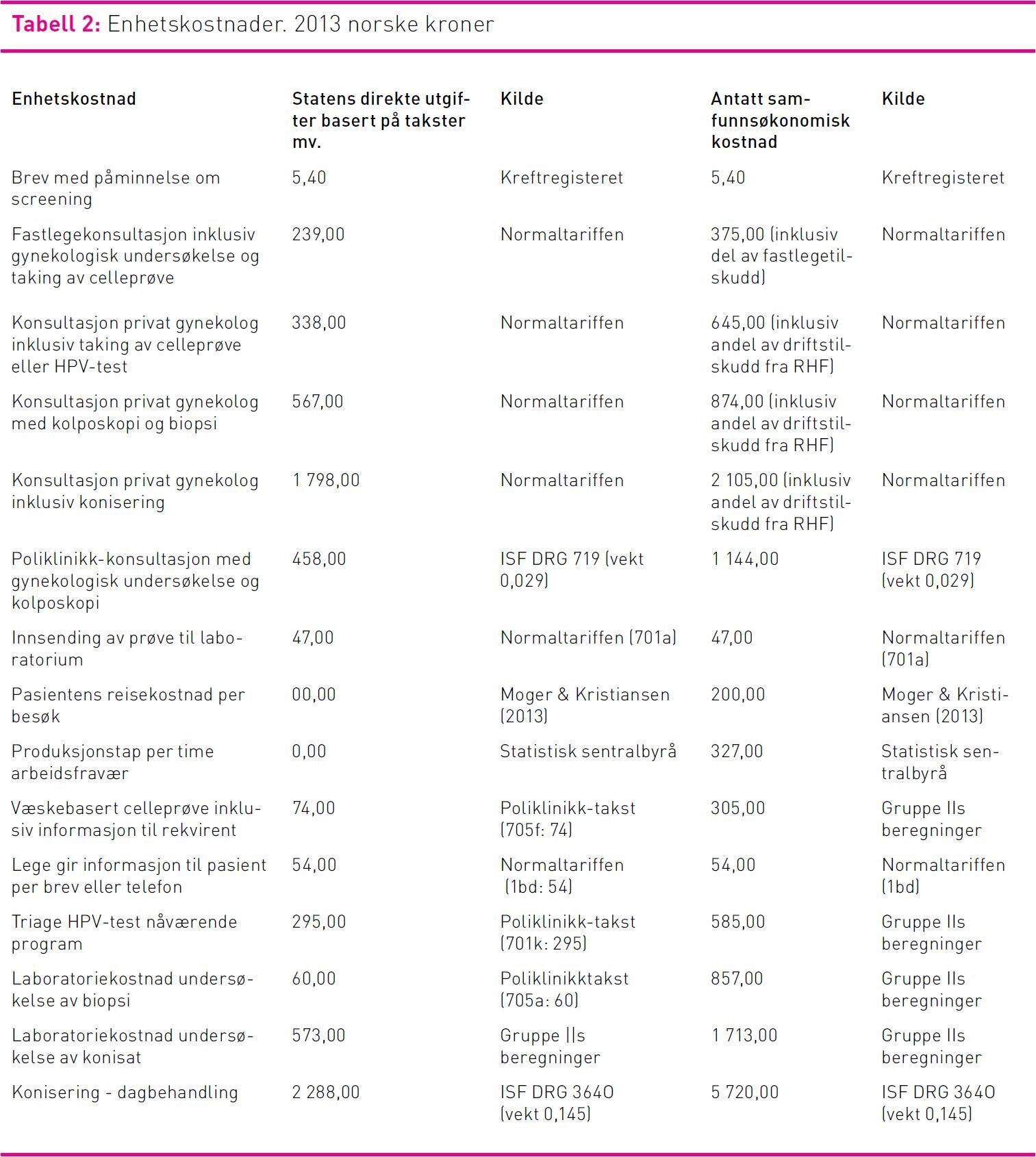 Vi beregnet både statlige og samfunnsøkonomiske enhetskostnader av aktiviteter som genereres som følge av screeningprogrammet (tabell 2). De samfunnsøkonomiske enhetskostnadene ble basert på ulike beregninger av faktiske kostnader, mens statens utgifter ble basert på de ulike takstsystemene: Innsatsstyrt Finansiering (DRG-systemet) (17,18) og Normaltariffen (19,20), og uttrykt med 2013 priser. Alle beregninger i kostnadsanalysen er basert på antakelsen om at celleprøver gjøres med væskebasert metode, men vi har ikke inkludert kostnadene ved biobank. Ettersom dekningen av væskebasert metode fortsatt begrenset seg til 40 prosent av screeningprøvene i 2013 og metoden er noe dyrere enn konvensjonelt utstryk, er de beregnete kostnadene høyere enn de faktiske kostnadene i dag. Likevel forventes de fleste laboratorier å gå over til væskebasert metode innen få år.