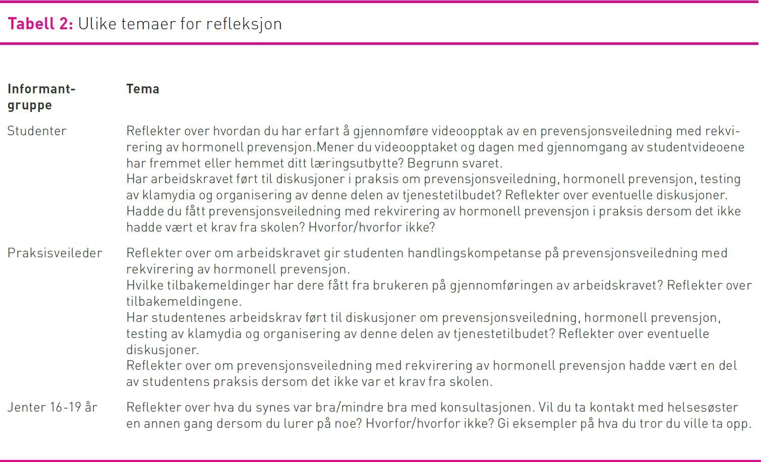 Informantene var helsesøsterstudenter fra en høyskole i Norge, som for første gang prøvde ut det reviderte undervisningsopplegget. Informantene var også studentenes veiledere i praksis, samt brukere av tjenesten. Brukerne var jenter som oppsøkte skolehelsetjenesten eller helsestasjon for ungdom for å få prevensjonsveiledning i den perioden helsesøsterstudentene gjennomførte sine praktiske studier. Etter at helsesøsterstudentene hadde utført prevensjonsveiledningen med opptak av video, ble jentene (brukerne), studentene og veilederne i praksis invitert til å delta i studien. 20 helsesøsterstudenter, 20 praksisveiledere og 20 jenter i alderen 16–19 år valgte frivillig å delta. De tre informantgruppene skrev refleksjonsnotater, hvor de reflekterte over ulike temaer. Temaene ble utarbeidet på bakgrunn av teori om læring og veiledning (tabell 2). Informantene fikk muntlig og skriftlig informasjon om studiens hensikt, og de samtykket til å delta i studien ved å sende inn refleksjonsnotatene i ferdig frankerte konvolutter til forskerne. Alle refleksjonsnotatene var anonyme og kunne ikke spores tilbake til informanten.