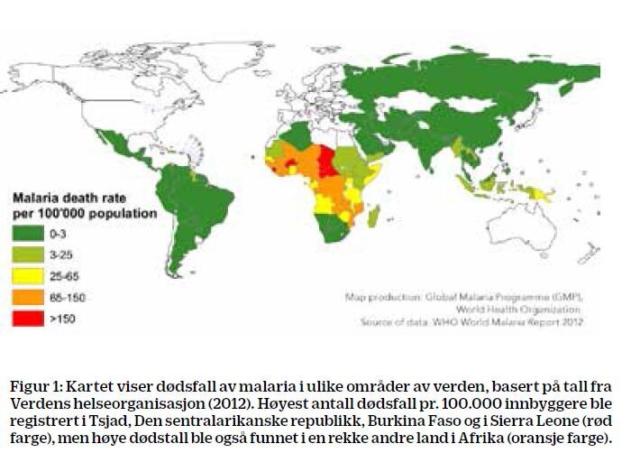 Malaria er utbredt over store deler av den tropiske verden. Afrika er hardest rammet, men infeksjonen er også et problem i områder i Asia, Oceania og i noen grad i Sør- og Mellom-Amerika. Verdens helseorganisasjon har beregnet at det i 2012 var 207 millioner tilfeller og 627 000 dødsfall på grunn av malaria (3,4). Det er tall som er lavere enn tidligere beregninger. De fleste som dør, er barn i Afrika (se figur 1). Stor usikkerhet er knyttet til tallene, men det er sikkert at både antall malariatilfeller og dødsfall i flere områder har gått betydelig ned de siste åra. Samtidig har nok forekomsten økt i noen områder, og dessuten må vi være klar over at mangelfull registrering og underrapportering er et problem, noe blant annet undersøkelser i India har vist (5).