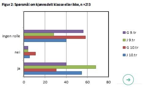 Spørsmålet kjønnsdelt eller ikke, fikk statistisk signifikans for forskjell mellom kjønn, hvor jenter ønsket kjønnsdelt undervisning. For niende trinn-jenter ønsket 67,9 prosent undervisning i jentegruppe, mens det for guttene spilte en mindre rolle (se figur 2). For kontrollgruppen (kun tiende trinn) som ikke fikk kjønnsdelt undervisning, var det tvert imot en overvekt av at det ikke spiller noen rolle om det var kjønnsdeling eller ikke.
