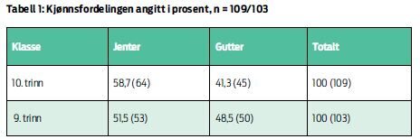 Metoden var triangulering; observasjon, intervju og spørreskjema. Målgruppen var ungdomsskoleelever, med tverrsnittsdata av elever i niende og tiende trinn. Datamaterialet besto av 212 elever; 109 i tiende trinn og 103 i niende trinn. Tabell 1 viser kjønnsfordeling og klasser. To skoler ble inkludert, derav en kasus- og en kontrollgruppe. Kontrollgruppa var liten, bare 19 elever, så resultatene må derfor vurderes i undervisningens kontekst.