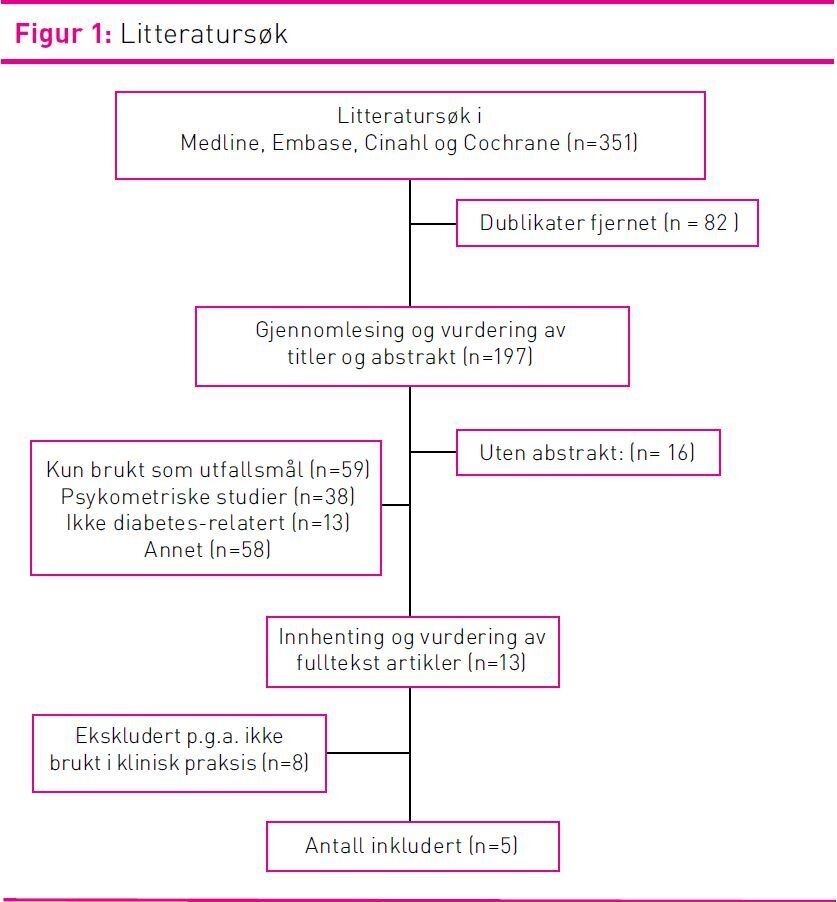 Totalt 197 publikasjoner ble identifisert gjennom vårt litteratursøk. Etter gjennomgang av titler og abstrakt, ble 16 artikler ekskludert på grunn av manglende abstrakt. I tillegg ekskluderte vi 13 artikler som ikke var diabetesrelaterte. Totalt 59 artikler ble ekskludert fordi PAID kun var benyttet som utfallsmål i intervensjoner, eller at PAID ikke var benyttet i diabeteskonsultasjoner. 38 ble ekskludert fordi de utelukkende handlet om psykometriske egenskaper. Totalt 13 artikler ble lest i fulltekst (figur 1). Av disse var det fem artikler som hadde fokus på PAID brukt som kartleggings- og arbeidsverktøy i diabeteskonsultasjoner og som dermed ble inkludert i studien.