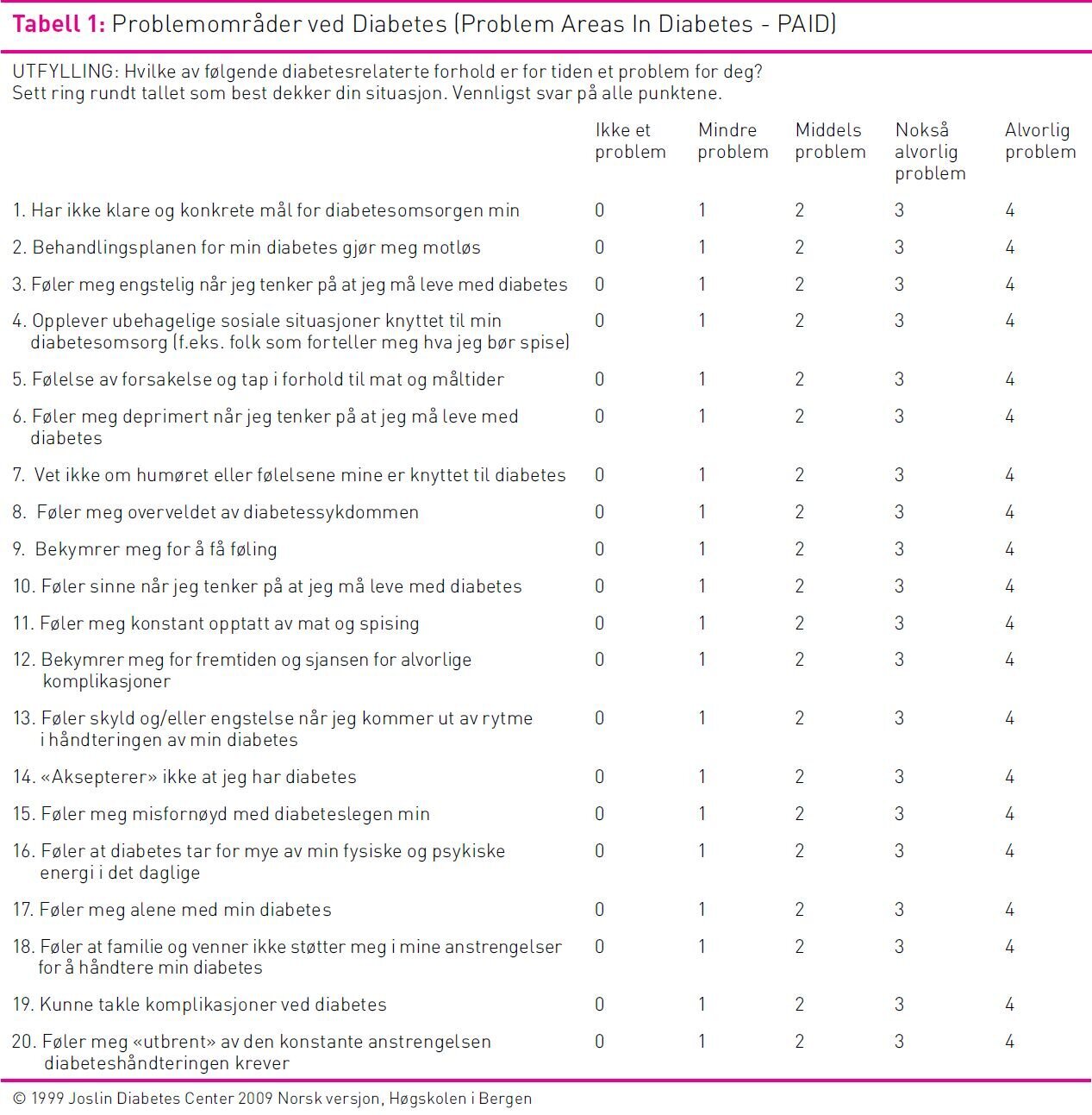 «Problem Areas In Diabetes scale» (PAID) er et kartleggingsinstrument utviklet av Polonsky og kollegaer ved Joslin Diabetes Center i USA i 1995 (21). Instrumentet er oversatt til mange språk og har i flere studier vist tilfredsstillende psykometriske egenskaper (21,22). PAID er anbefalt både for bruk i forskning og som kartleggings- og arbeidsverktøy i klinisk praksis (23–25). Instrumentet består av 20 påstander knyttet til diabetesrelaterte problemområder og kan benyttes både ved diabetes type 1 og type 2 (tabell 2). Påstandene berører blant annet opplevelser som engstelse, bekymring, motløshet, forsakelse, sinne, frykt, sosial støtte og skyldfølelse knyttet til sykdommen generelt, den medisinske behandlingen, kost, hypoglykemi og andre komplikasjoner. Svarene rangeres på en Likert-skala fra 0 (ikke et problem) til 4 (et alvorlig problem). Totalsummen multipliseres med 1,25 for å få en skala fra 0–100. Jo høyere totalsum, jo høyere grad av diabetesrelaterte emosjonelle problemer (24). PAID-skår > 40 er foreslått som grense for hva som bør oppfattes som mer alvorlig psykososial problematikk med behov for et utvidet oppfølgings- og behandlingstilbud (9,18).