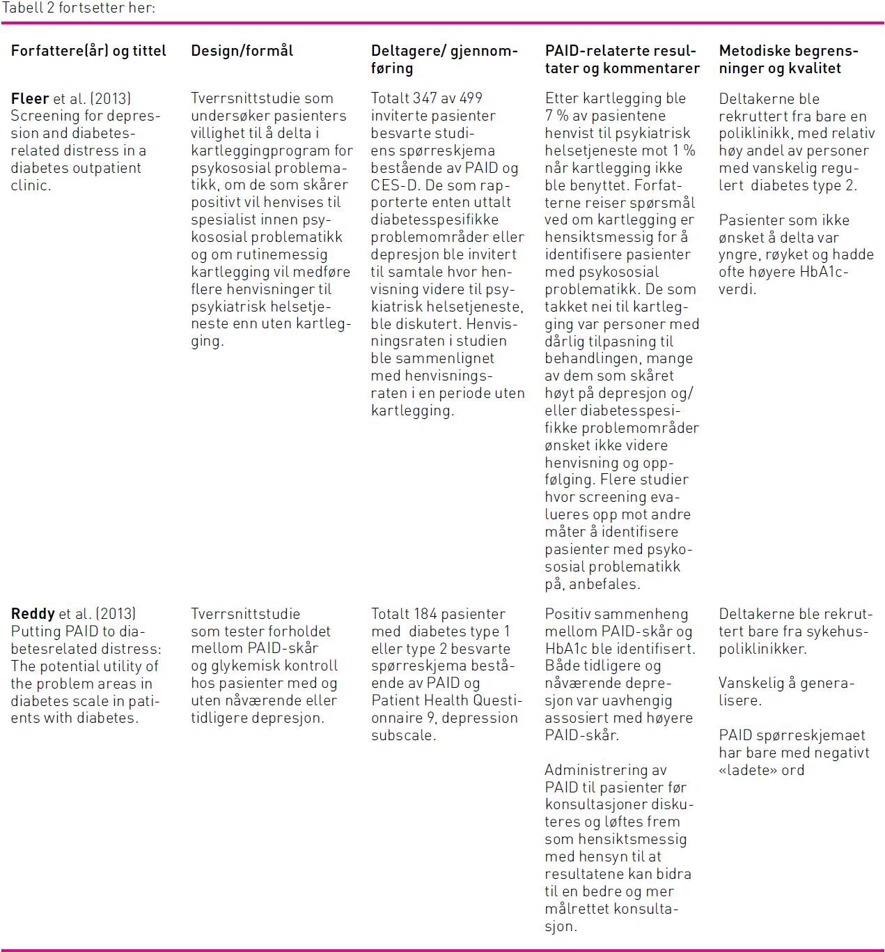 Konklusjon: Bruk av PAID-instrumentet i klinisk praksis vil kunne gi positive helsegevinster hos personer med diabetes. Det er imidlertid behov for flere og større longitudinelle studier for systematisk å evaluere effekten av å implementere PAID i klinisk praksis.