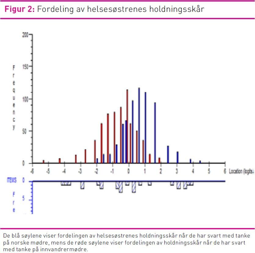 I Rasch-analysen som er benyttet i denne artikkelen, ble helsesøstrenes holdningsskår og utsagnenes affektive nivåer oppgitt i log-enheter og avsatt langs et felles kontinuum av det som måles (i dette tilfellet INL). Nullpunktet i kontinuumet angir utsagnenes gjennomsnittlige affektive nivå. Helsesøstre med høyere holdningsskår enn null log-enheter vil ligge til høyre for nullpunktet, mens helsesøstre med lavere holdningsskår vil ligge til venstre (37). Dette prinsippet er vist i figur 2 for å demonstrere hvordan helsesøstrenes holdningsskår på INL-konstruktet fordelte seg når de har svart med tanke på henholdsvis etnisk norske mødre og innvandrermødre.