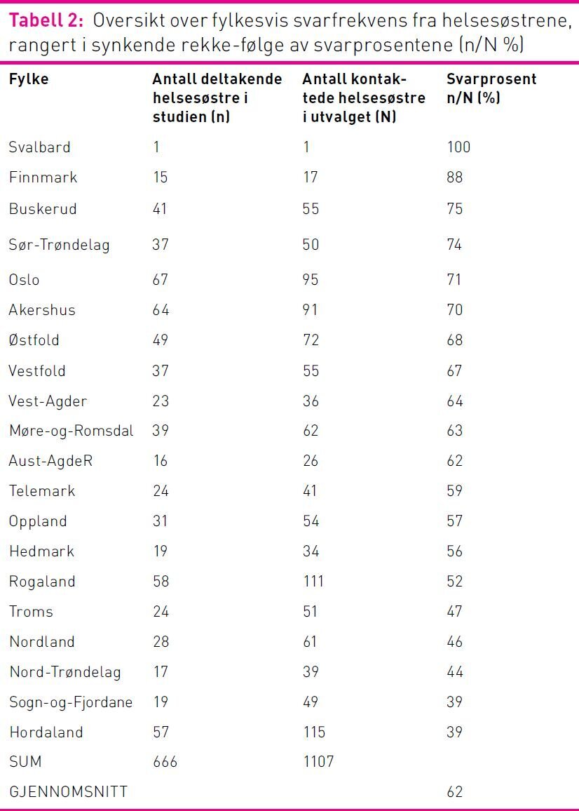Tabell 2 viser fylkesvis fordeling av respondentene i forhold til hvor mange helsesøstre som i utgangspunktet ble kontaktet, samt utregnet svarprosent.