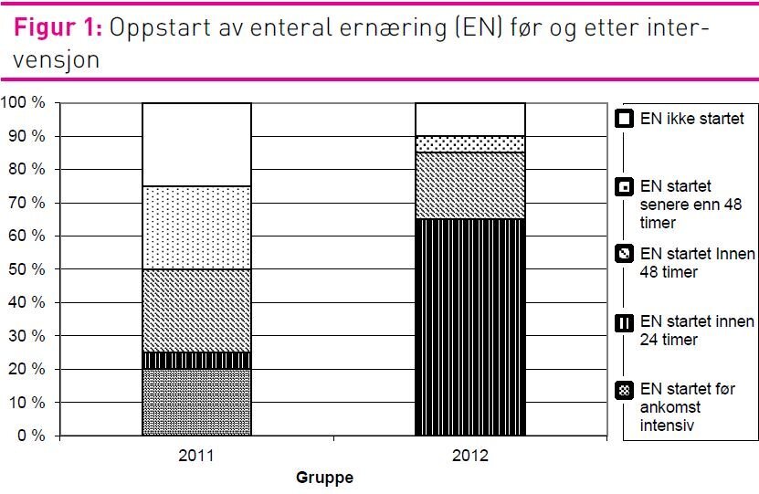 I 2011-gruppen fikk 15 pasienter (75 prosent) EN og i 2012-gruppen fikk 18 pasienter (90 prosent) EN (figur 1), men denne forskjellen var ikke signifikant. Oppstart av EN innen ankomst til avdelingen beskriver ikke intensivavdelingens praksis. Derfor ble bare de pasientene som fikk startet EN på intensivavdelingen inkludert i sammenlikning av oppstartstidspunktet for EN mellom gruppene. Det var en statistisk signifikant økning i andel pasienter som fikk EN innen 24 timer etter ankomst til intensivavdelingen, fra 9 prosent (n=11) i 2011-gruppen til 72 prosent (n=18) i 2012-gruppen (p = 0,001). Det var også en økning i andelen pasienter som fikk EN innen 48 timer etter ankomst til intensivavdelingen, fra 54 prosent i 2011 til 94 prosent i 2012 (p = 0,018) (figur 1).