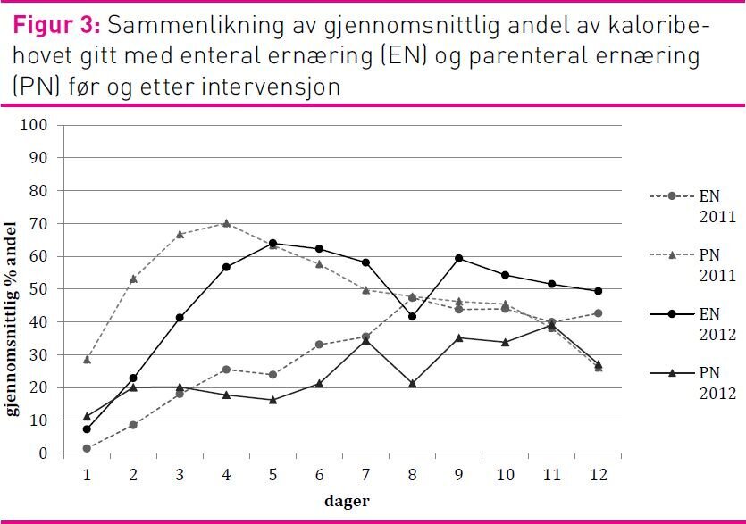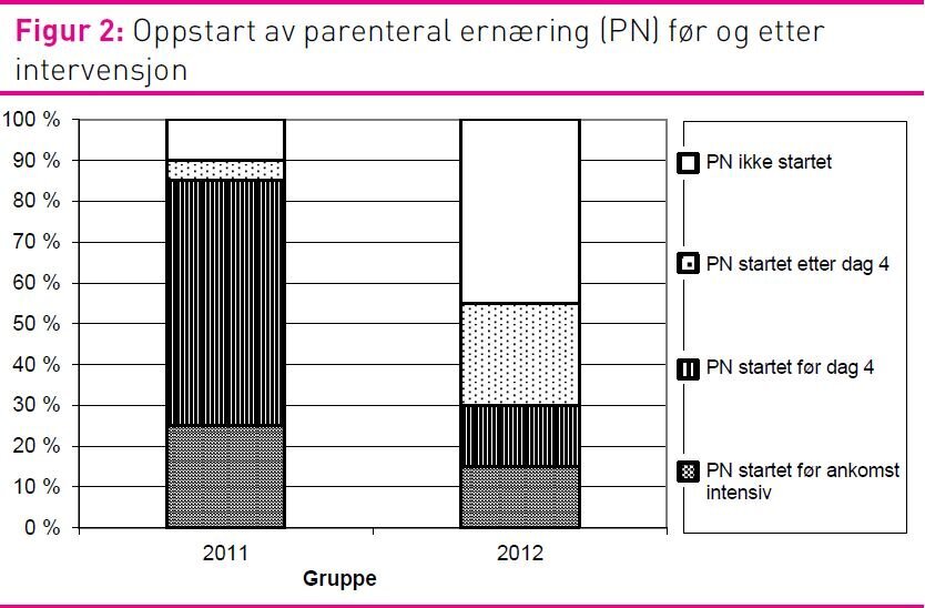 Andelen pasienter som fikk PN var redusert fra 90 prosent i 2011-gruppen til 55 prosent i 2012-gruppen (p = 0,031). Ved sammenlikning av pasienter som fikk startet PN på intensivavdelingen, var andelen pasienter som fikk PN tidlig (før dag 4) redusert fra 92 prosent (n=13) i 2011 til 37,5 prosent (n=8) i 2012 (p = 0,011) (figur 2).