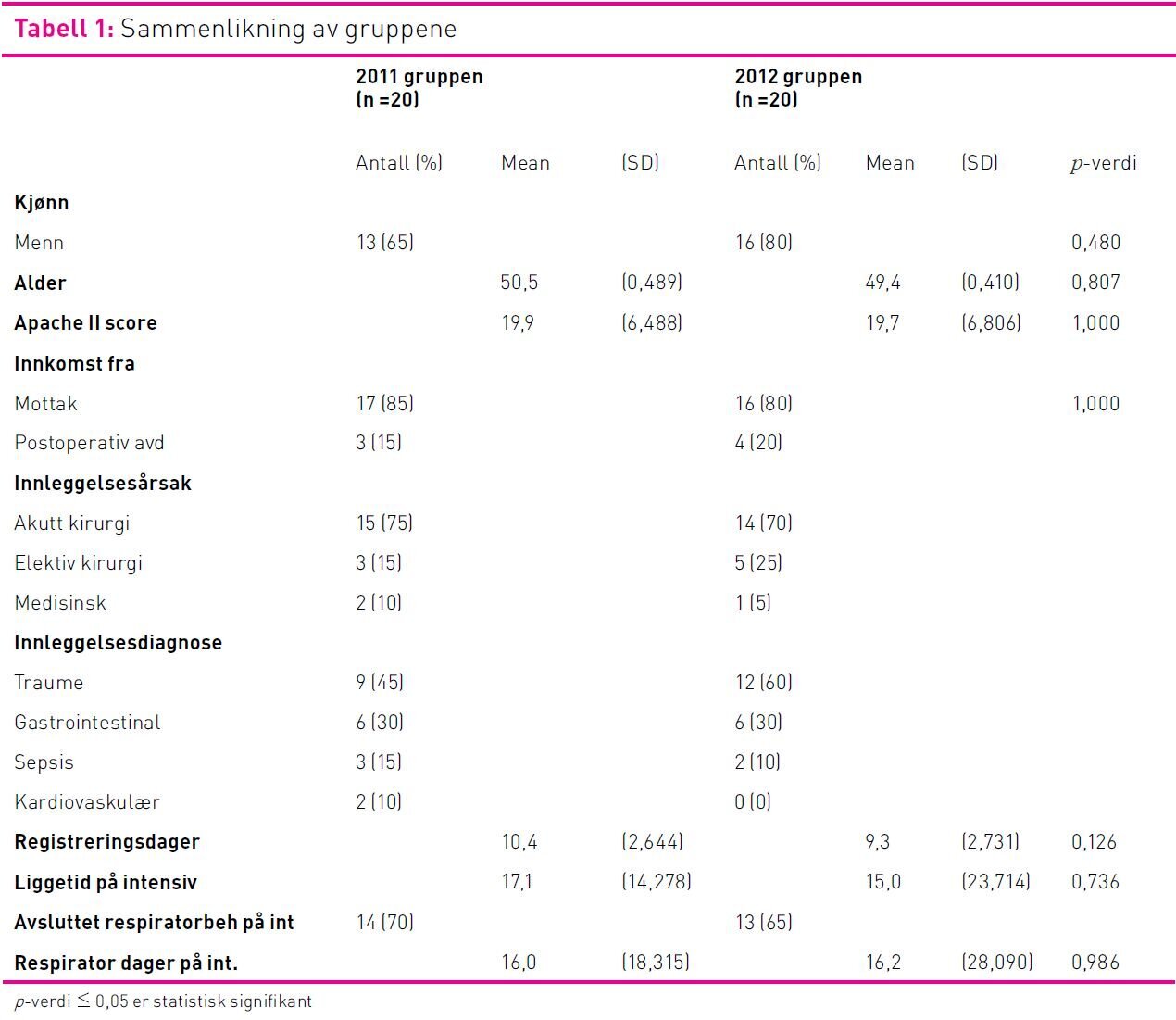 Pasientene på intensivavdelingen ble fortløpende inkludert til to grupper, den ene fra mai 2011 og den andre fra september 2012 inntil kravet om 20 pasienter i hver gruppe ble oppnådd. Data samlet i forbindelse med deltakelsen i INS ble benyttet for å beskrive praksis før intervensjonen (2011-gruppen). Samme metode ble benyttet for å beskrive praksis etter intervensjonen (2012-gruppen). Inklusjonskriteriene var: