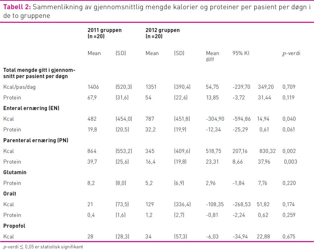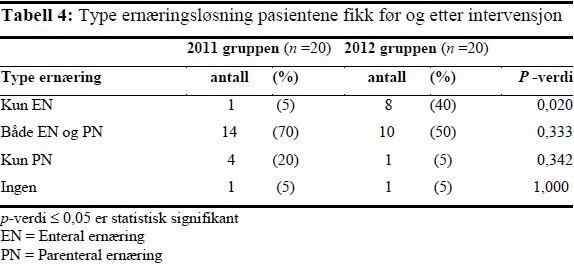 Det var statistisk signifikante forskjeller i mengde kalorier og proteiner pasientene fikk av EN og PN. Pasientene fikk mer EN og mindre PN i 2012-gruppen sammenliknet med 2011-gruppen. Det var ikke statistisk signifikant forskjell i gjennomsnittlig total mengde kalorier og proteiner pasientene fikk (tabell 2).