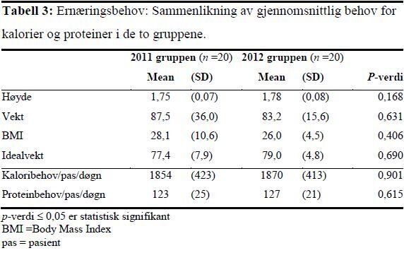 Det var ikke signifikante forskjeller i pasientkarakteristika i de to gruppene når det gjelder alder, innleggelsesdiagnose eller type innleggelse (tabell 1). Det var ingen statistisk signifikante forskjeller mellom pasientenes gjennomsnittlige ernæringsbehov eller parametere som påvirker behovet i de to gruppene. I 2011-gruppen fikk fire (20 prosent) og i 2012-gruppen fem (25 prosent) av pasientene dialysebehandling.