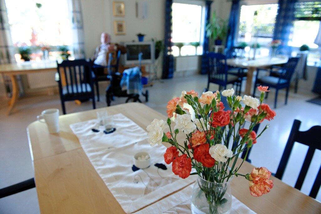 Bildet viser spisesalen på et sykehjem med blomster på bordet og en mannlig beboer i bakgrunnen