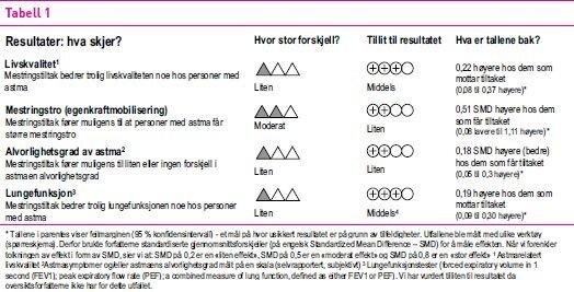 I systematiske oversikter samles tilgjengelig forskning. I denne systematiske oversikten har forfatterne samlet forskning om og vurdert effekt av ulike mestringstiltak for personer med astma. Nedenfor vises resultatene for mestringstiltak sammenliknet med vanlig oppfølging.