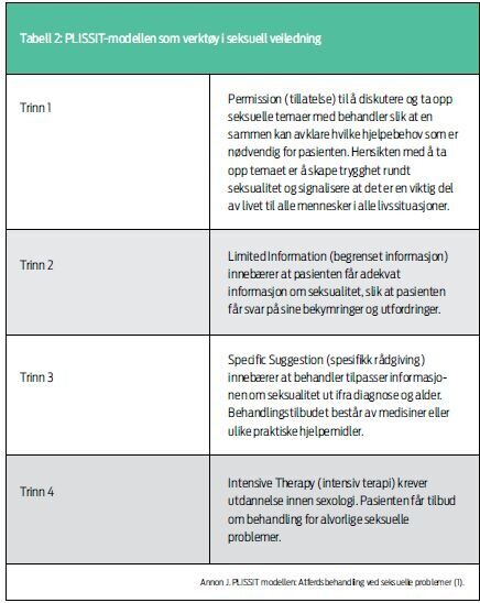 Det eldste og mest anerkjente verktøyet ved seksuell veiledning er PLISSIT-modellen (se tabell 2). Dette er en firetrinnsmodell der helsepersonell og pasient tilnærmer seg en seksuell problemstilling i forhold til egen kompetanse og bekvemmelighetsnivå (1). Hensikten med PLISSIT-modellens tre første trinn er å yte hjelp til selvhjelp. Dersom veiledning basert på disse tre trinnene ikke er tilstrekkelig for å oppnå tilfredsstillende seksuell funksjonsevne, anbefaler man at pasient og partner blir henvist til terapi hos spesialist i sexologi.