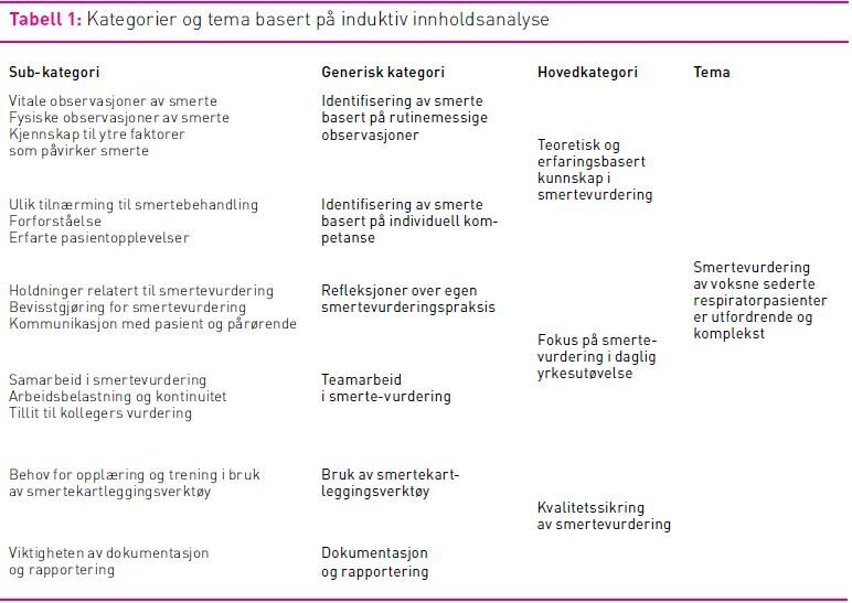Intervjuene ble analysert i henhold til induktiv innholdsanalyse beskrevet av Elo og Kyngäs i tre hovedfaser: Forberedelse, organisering og rapportering (20). Forberedelsesfasen innebærer transkribering og identifisering av meningsenheter i hvert intervju for seg. Organiseringsfasen inkluderer fem trinn: Åpen koding, samling av kodene, gruppering, generisk kategorisering og hovedkategorisering. Rapporteringsfasen innebærer en abstraksjon av hovedkategoriene til et tema, og en strukturert presentasjon av resultatene. Etter transkribering ble intervjuene lest grundig igjennom hver for seg, og meningsenheter identifisert ut fra studiens hensikt og forskningsspørsmål. Åpen koding innebar en samling av meningsenheter med beslektet innhold under felles dekkende benevnelser i hvert enkelt intervju for seg. Deretter ble kodene fra alle tre intervjuene sett på under ett og justert mot hverandre og beslektede og overlappende koder slått sammen. Kodene ble så gruppert i subkategorier, generiske kategorier og hovedkategorier, gjennom en teoretisering av intensivsykepleiernes beskrivelser av sin smertevurdering. Til slutt ble hovedkategoriene abstrahert til et overordnet tema som beskriver det latente innholdet i intensivsykepleiernes beskrivelse av sin smertevurdering. Tabell 1 viser fremstillingen av kategorier og tema. Gjennom hele analyseprosessen ble analysematerialet sammenholdt med de transkriberte intervjuene slik at meningsinnholdet i fokusgruppeintervjuene gjenspeiles. Prosjektets andreforfatter deltok i alle trinnene i analyseprosessen, med innspill på valg av meningsenheter og samling under dekkende kodeord, og som diskusjonspartner under kategorisering og beskrivelse av overordnet tema.