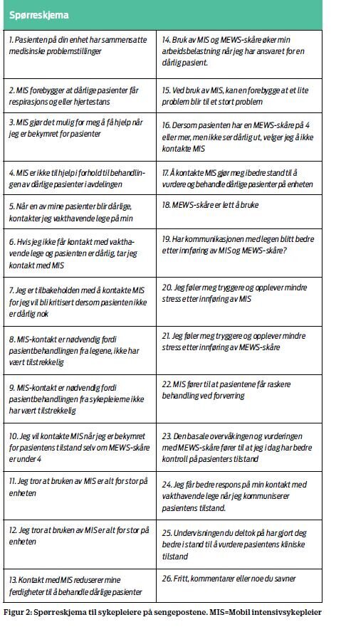 Data ble innhentet ved bruk av en norsk versjon av et kanadisk validert spørreskjema (3) som ble oversatt etter en standardisert prosedyre (12). Spørreskjemaet inneholder 17 ulike påstander om sykepleiernes holdninger og atferd relatert til MEWS-verktøyet. De resterende ni (spørsmål 18 til 26) ble lagt til for å få et mer utfyllende bilde. De første 25 spørsmålene hadde svaralternativene helt uenig, uenig, usikker, enig eller helt enig (det vil si femgradert Likert-skala). Spørsmål 26 kunne besvares i fritekst.